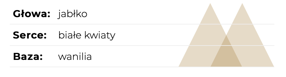 Lekki, subtelny i apetyczny zapach przywołujący na myśl słoneczny dzień. Kompozycja białych kwiatów idealnie współgra z nutą pomarańczy i świeżym jabłkiem. Zapach delikatnie orzeźwia a w chłodniejsze dni otula ciepłem wanilii. Perfumy stworzone dla nowoczesnej, pewnej siebie kobiety.