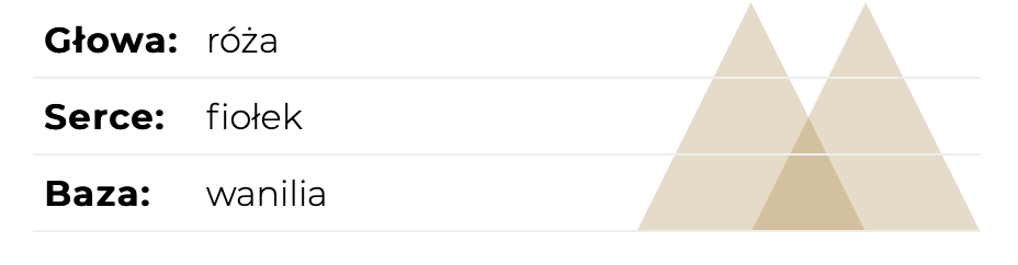 Wytworna, pudrowo–kwiatowa kompozycja jest jak połączenie wielkomiejskiego szumu z naturalnym pięknem wiosennej łąki. Ciepła wanilia, piżmo, czarna porzeczka i urzekająca dzika róża to idealne perfumy dla aktywnych i spontanicznych kobiet.