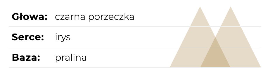 Romantyczna kompozycja słodkich owoców z dominującym przepychem irysa i pudrowego jaśminu. Całość dopełnia nieziemsko słodka i smakowita pralinka tworząc magiczny eliksir, który pobudza zmysły. Perfumy są ukłonem w stronę współczesnej kobiety–szczęśliwej i wolnej.